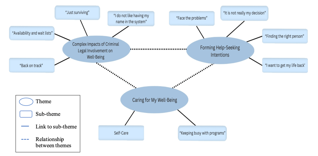 We developed three main themes from written responses: Complex impacts of criminal legal involvement on well-being (subthemes: “Back on track,” “Availability and wait lists,” “Just surviving,” and “I do not like having my name in the system”), Forming help-seeking intentions (subthemes: “Face the problems,” “It is not really my decision,” “Finding the right person,” and “I want to get my life back”), and Caring for my well-being (subthemes: Self-care, “Keeping busy with programs”).