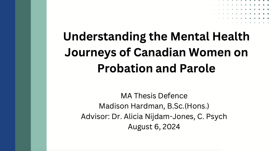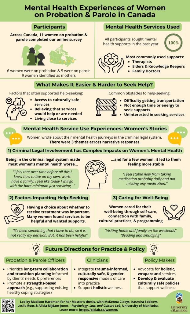 Our research team includes graduate and undergraduate students and faculty from the University of Manitoba. We have experience in clinical and forensic psychology, and some of us have worked with justice-involved individuals in our clinical practice and research. This was our first time working on research involving women on probation and parole.